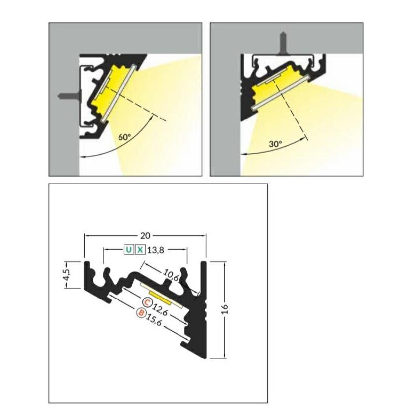 Profil bez difúzora s rôznymi rozmermi strán je možné inštalovať dvomi spôsobmi podľa potreby v 60° alebo 30° uhle.