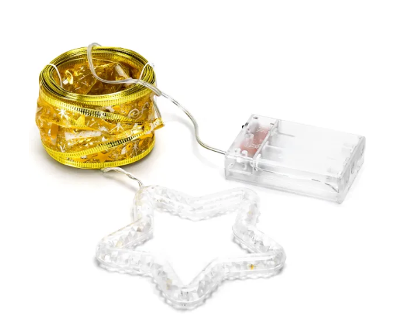 Elegantná zlatá stužka s hviezdou so zabudovanými LED svetielkami v teplej bielej farbe dĺžky 10 metrov. Napájaná tromi AA batériami (nie sú súčasťou balenia), s transparentnou batériovou skrinkou. Šírka stuhy 5 cm. Ideálna na dekoráciu interiéru, osláv či sviatočných príležitostí. IP20 – vhodná do vnútorných priestorov.