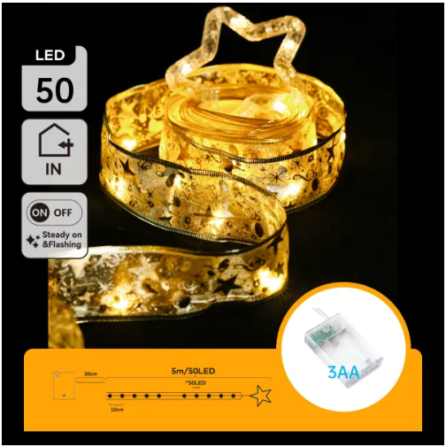 Elegantná zlatá stužka s hviezdou so zabudovanými LED svetielkami v teplej bielej farbe dĺžky 5 metrov. Napájaná tromi AA batériami (nie sú súčasťou balenia), s transparentnou batériovou skrinkou. Šírka stuhy 5 cm. Ideálna na dekoráciu interiéru, osláv či sviatočných príležitostí. IP20 – vhodná do vnútorných priestorov.