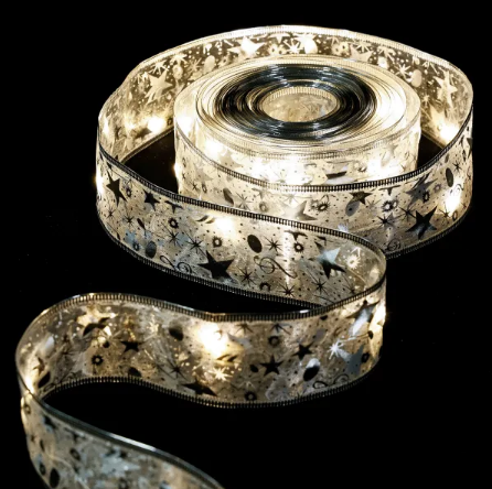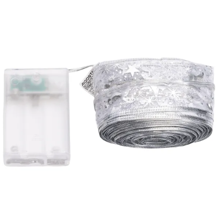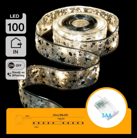 Elegantná strieborná stužka so zabudovanými LED svetielkami v teplej bielej farbe dĺžky 10 metrov. Napájaná tromi AA batériami (nie sú súčasťou balenia), s transparentnou batériovou skrinkou. Šírka stuhy 5 cm. Ideálna na dekoráciu interiéru, osláv či sviatočných príležitostí. IP20 – vhodná do vnútorných priestorov.