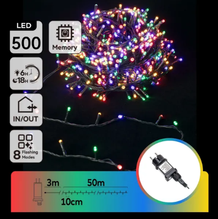 LED Vianočné osvetlenie - reťaz, 500 diód, 50m, IP44, 230V - Multicolor - 8 módov svietenia